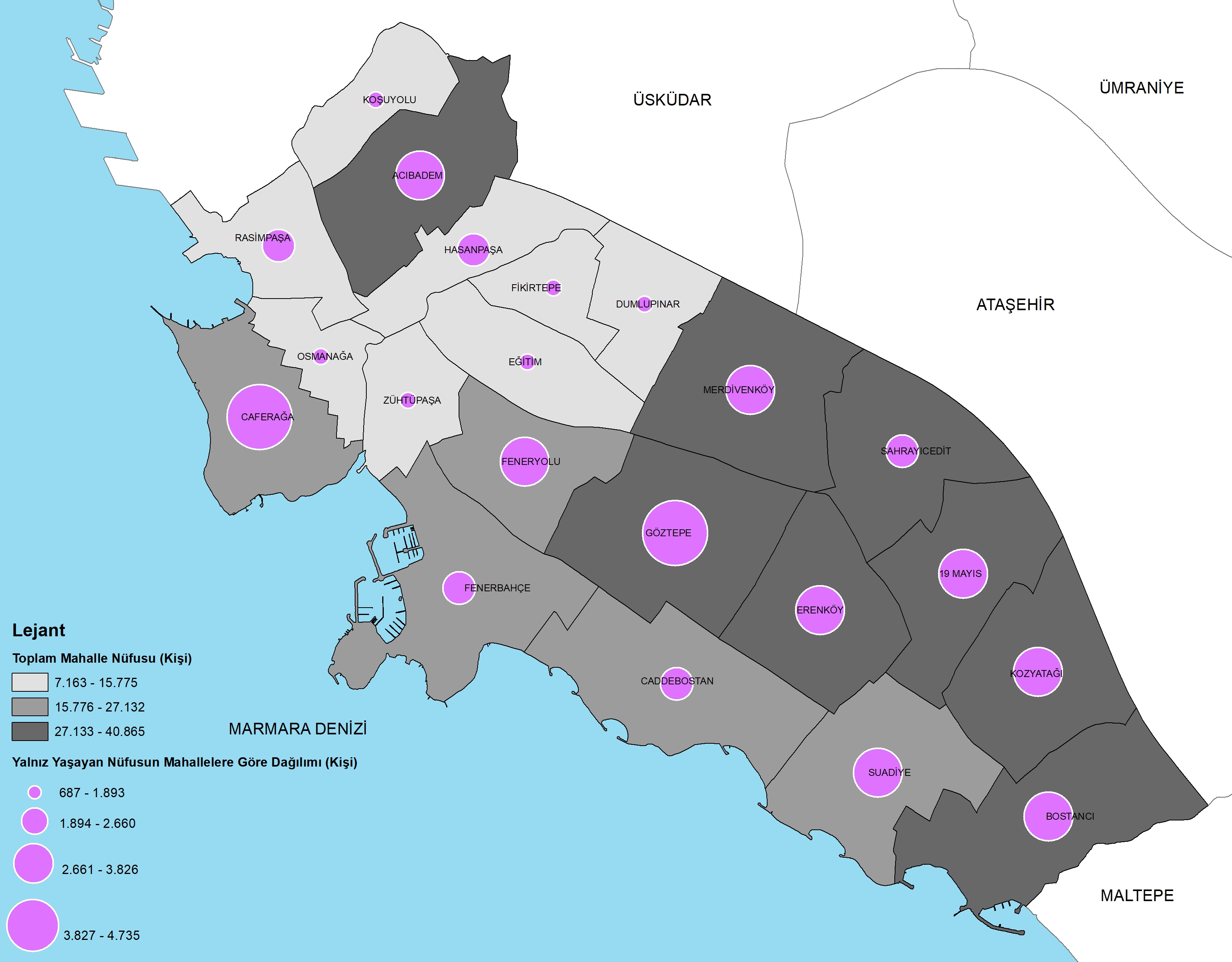 Kadıköy İlçesinde Yalnız Yaşayan Nüfusun Mahallelere Göre Dağılımı Haritası